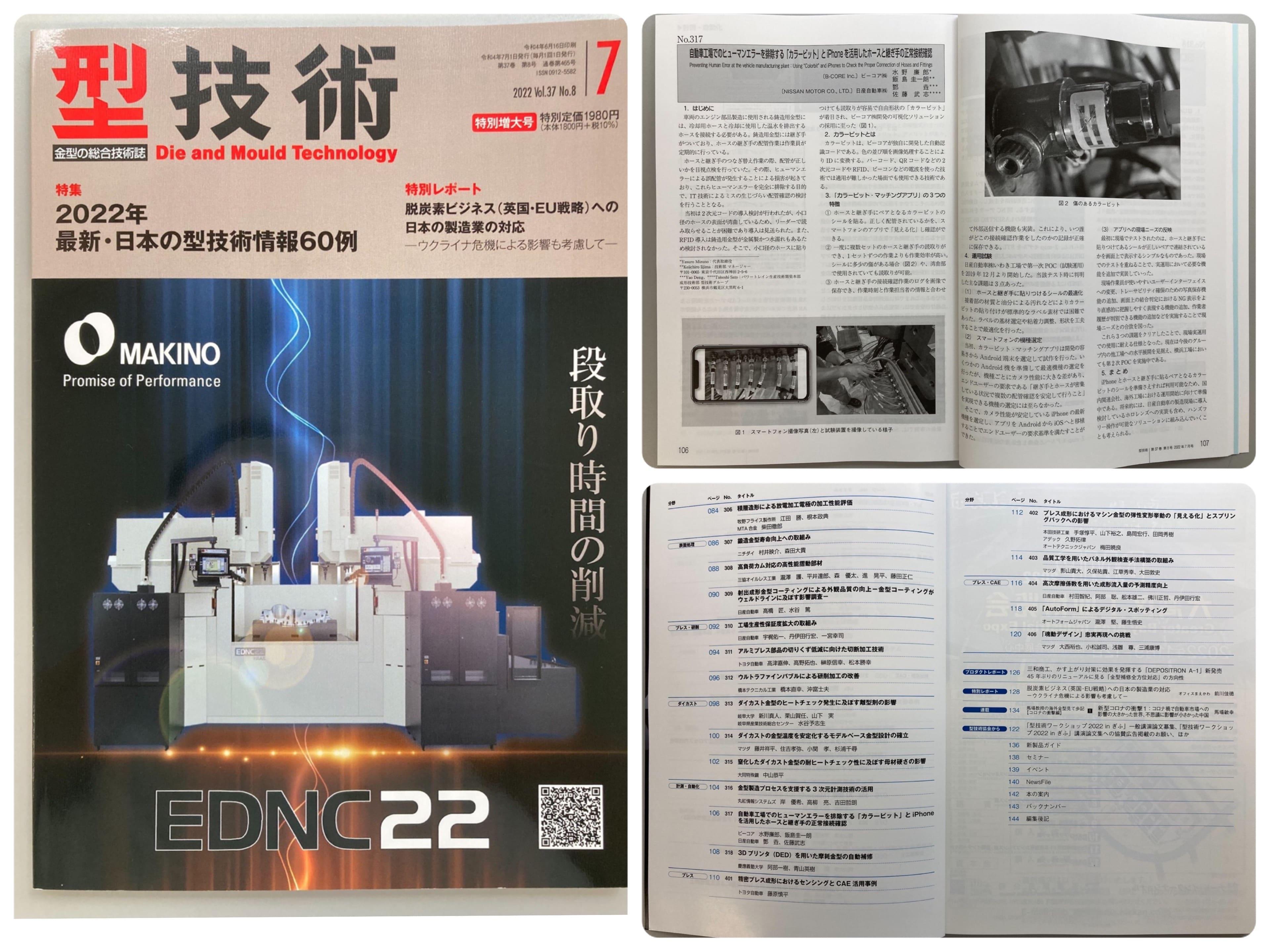 当初は2次元コードの導入検討が行われたが、小口径のホースの表面が湾曲しているため、リーダーで読み取らせることが困難であり導入は見送られた。また、 RFID導入は鋳造用金型が金属製かつ水濡れもあるため検討されなかった。そこで、小口径のホースに貼り付けても読取りが容易で自由形状の「カラービット」が着目され、ビーコア㈱開発の可視化ソリューションの採用に至った(図1)。